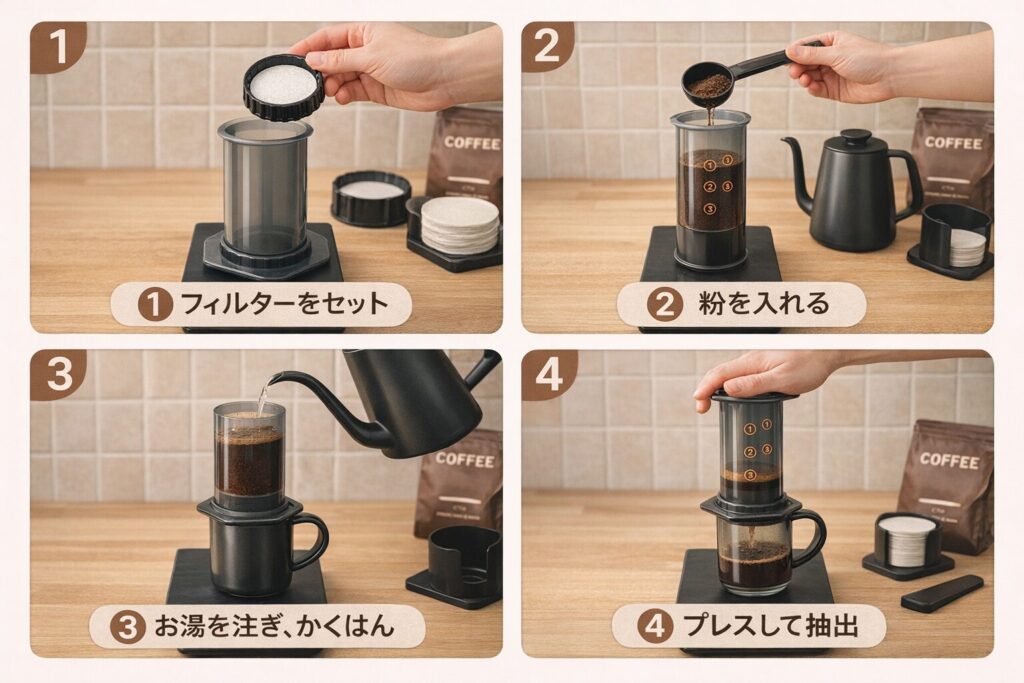 エアロプレスはシンプルに見えて、湯量・挽き目・時間・押す強さなどの組み合わせが多く、「エアロプレス 難しい」と感じる人が一定数います。